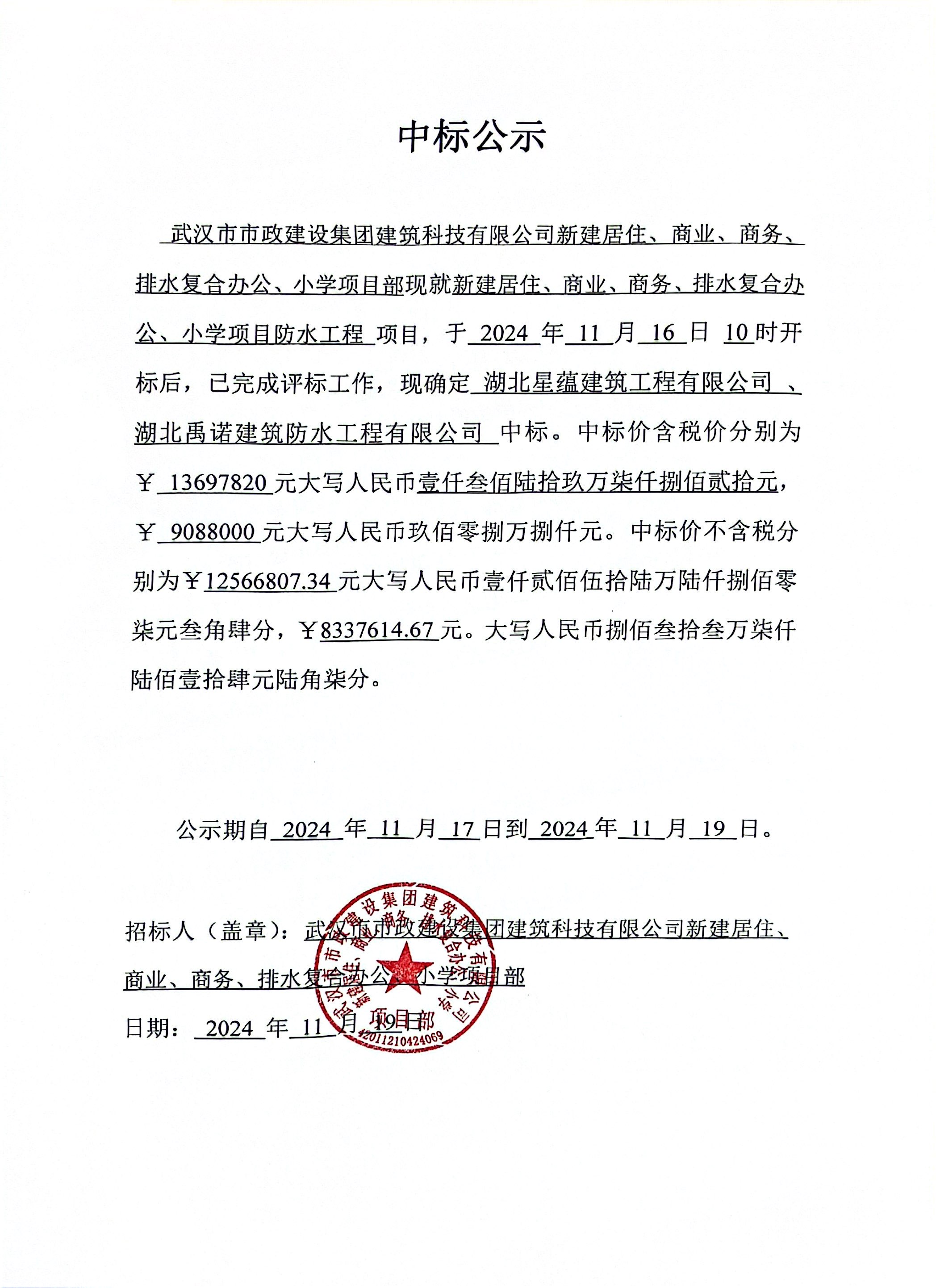 武漢市市政建設(shè)集團(tuán)建筑科技有限公司新建居住、商業(yè)、商務(wù)、排水復(fù)合辦公、小學(xué)項(xiàng)目防水工程中標(biāo)公示