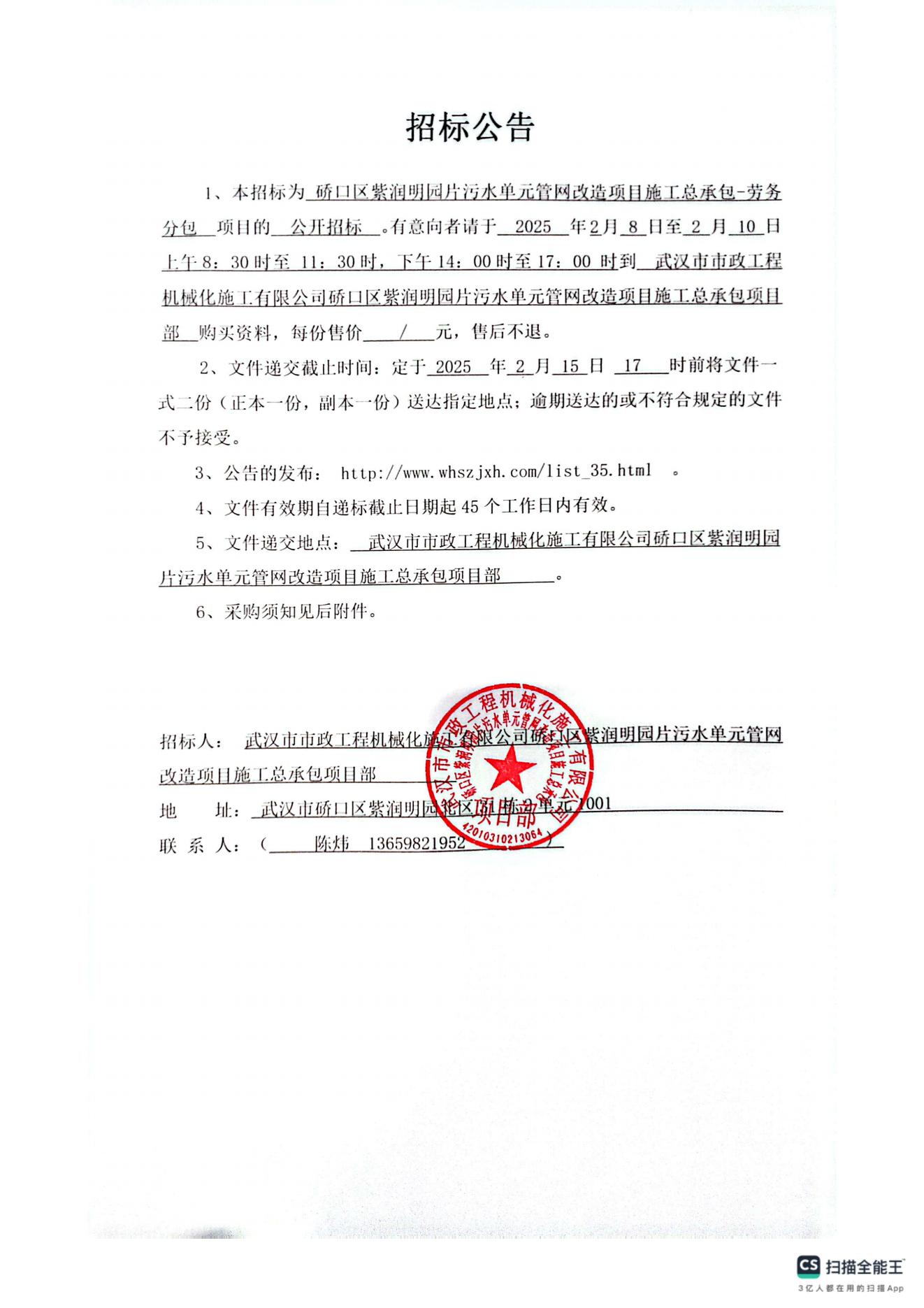 硚口區(qū)紫潤明園片污水單元管網(wǎng)改造項目施工總承包-勞務分包招標公告