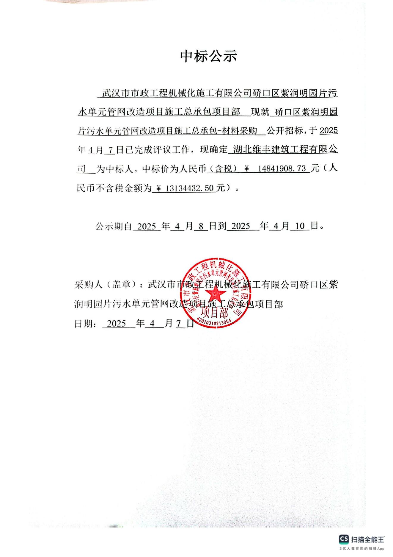 硚口區(qū)紫潤明園片污水單元管網(wǎng)改造項目施工總承包-材料采購中標(biāo)公示