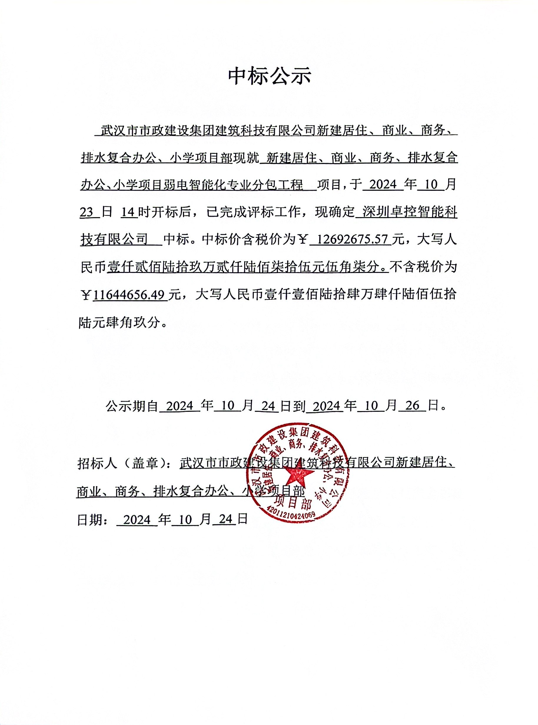 武漢市市政建設(shè)集團建筑科技有限公司新建居住、商業(yè)、商務(wù)、排水復(fù)合辦公、小學(xué)項目弱電智能化專業(yè)分包工程中標(biāo)公示