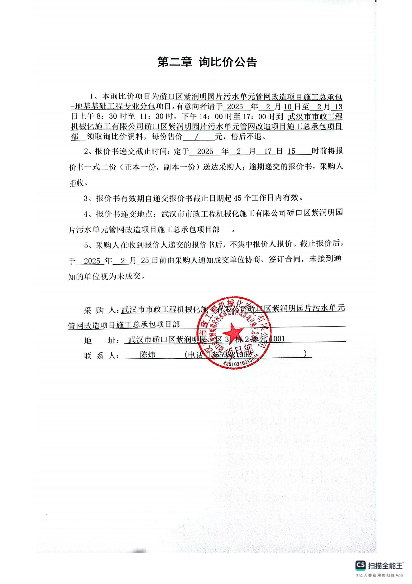 硚口區(qū)紫潤明園片污水單元管網(wǎng)改造項目施工總承包-地基基礎(chǔ)工程專業(yè)分包詢價公告