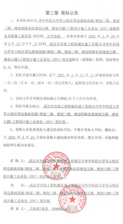 華中科技大學(xué)軍山校區(qū)周邊基礎(chǔ)設(shè)施(規(guī)劃二路、規(guī)劃三路、規(guī)劃四路東段規(guī)劃五路、規(guī)劃七路)工程設(shè)計(jì)施工總承包(EPC)道路排水及附屬工程勞務(wù)競標(biāo)公告
