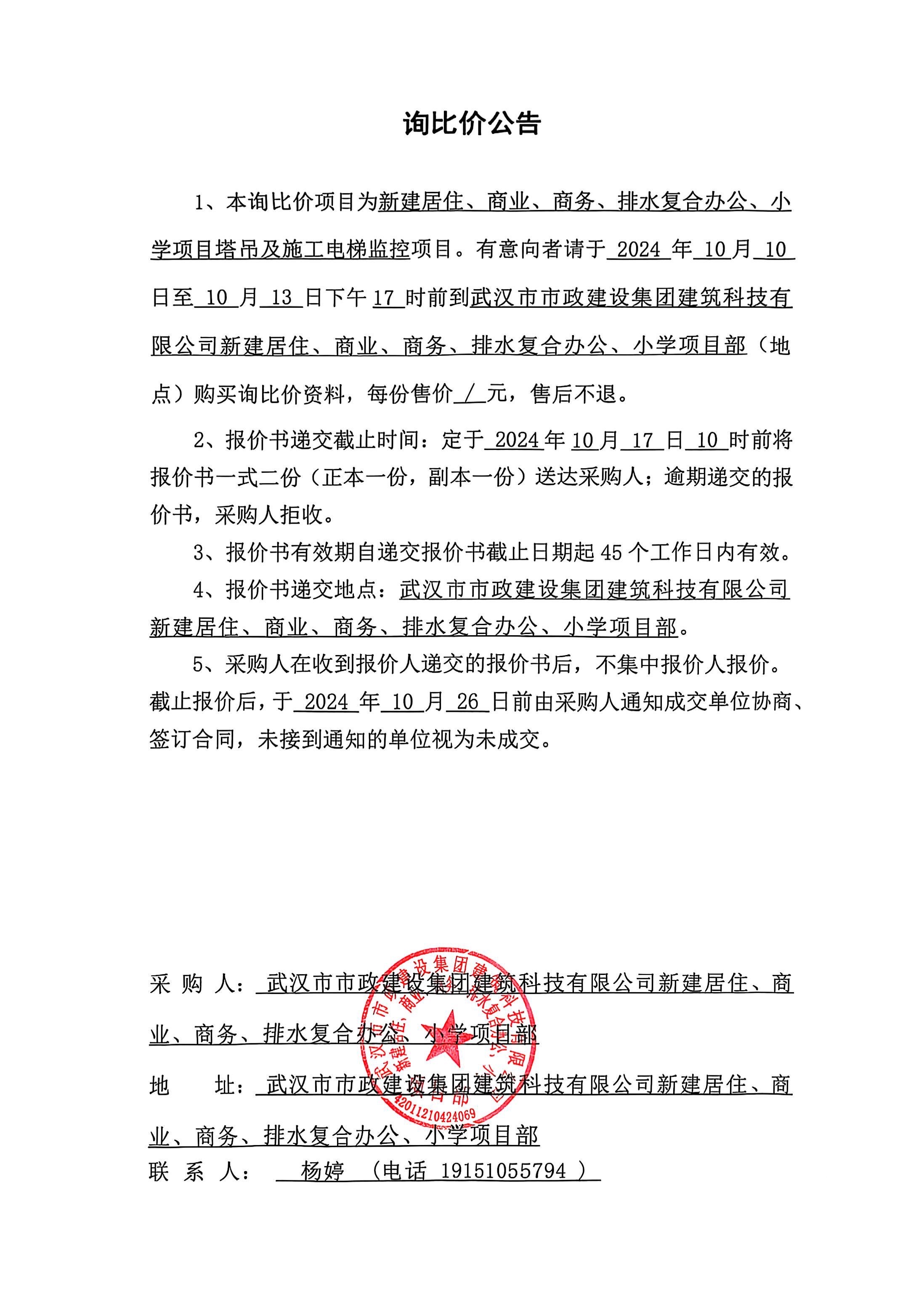 武漢市市政建設(shè)集團(tuán)建筑科技有限公司新建居住、商業(yè)、商務(wù)、排水復(fù)合辦公、小學(xué)項(xiàng)目塔吊及施工電梯監(jiān)控詢價(jià)公告