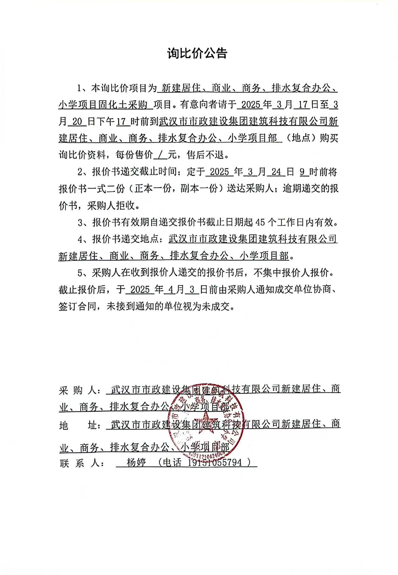 武漢市市政建設(shè)集團(tuán)建筑科技有限公司新建居住、商業(yè)、商務(wù)、排水復(fù)合辦公、小學(xué)項(xiàng)目固化土采購詢價(jià)公告