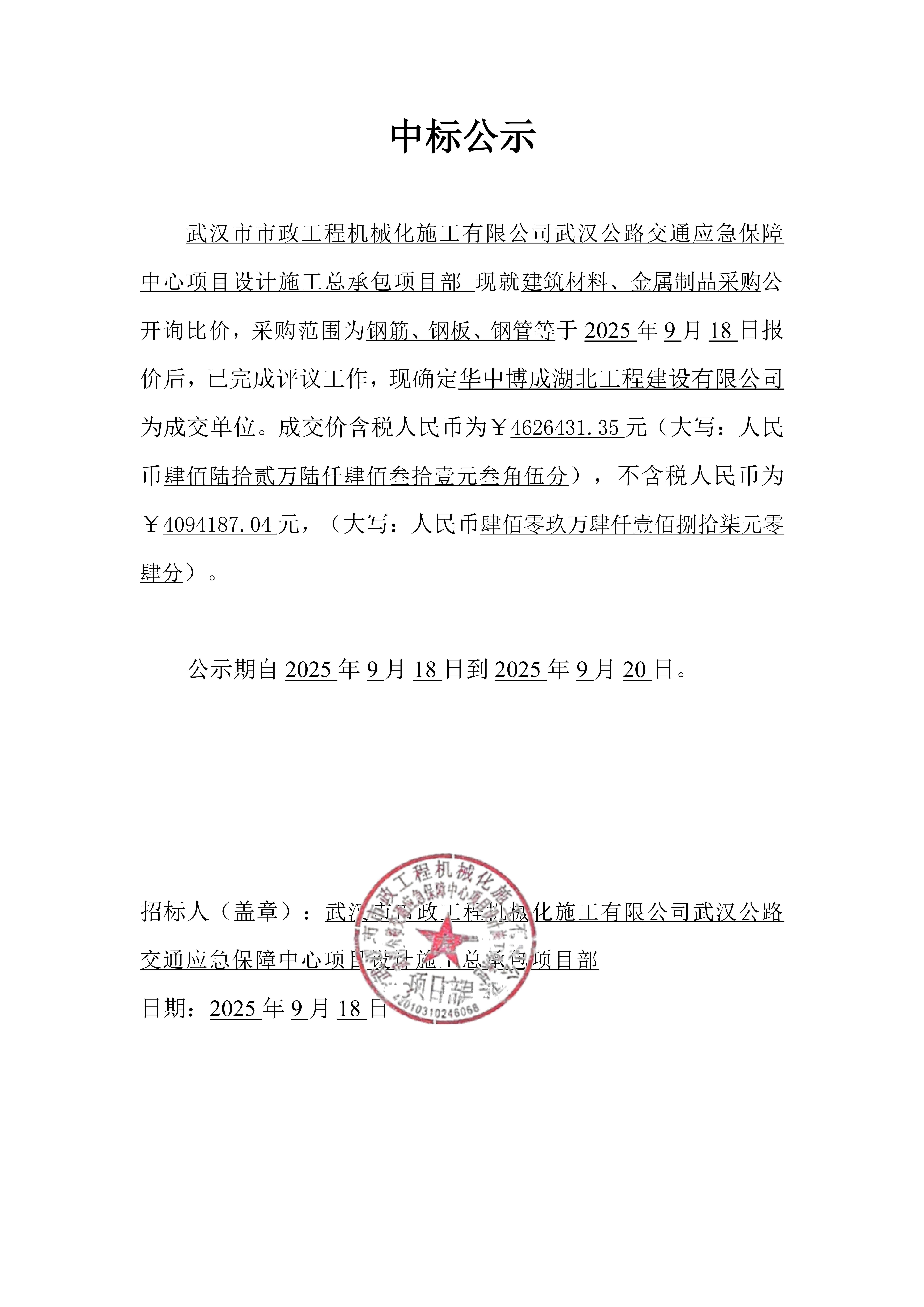 武漢公路交通應急保障中心項目設計施工總承包建筑材料、金屬制品采購中標公示