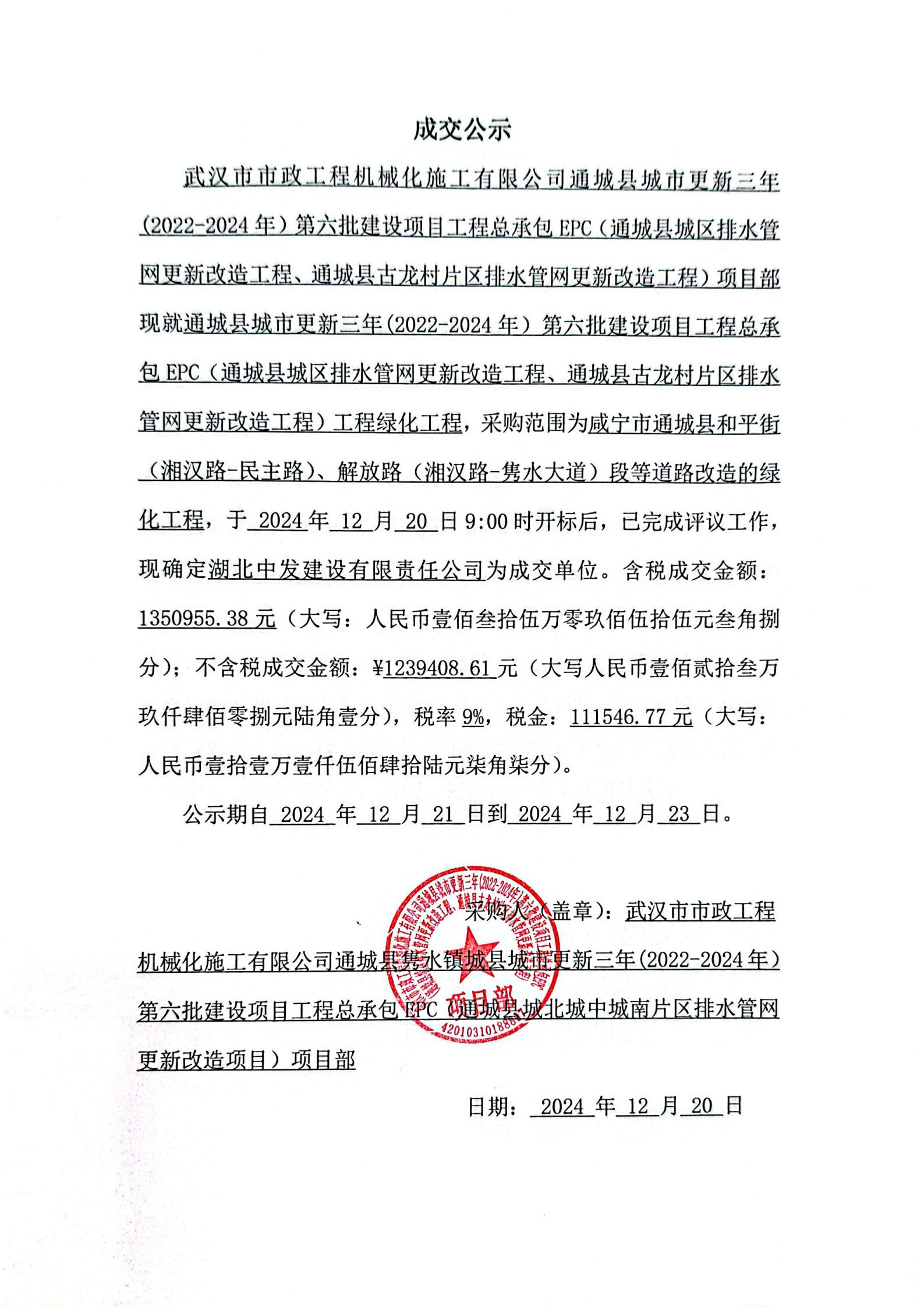 通城縣城市更新三年(2022-2024年)第六批建設(shè)項(xiàng)目工程總承包EPC(通城縣城區(qū)排水管網(wǎng)更新改造工程、通城縣古龍村片區(qū)排水管網(wǎng)更新改造工程)工程綠化工程成交公示