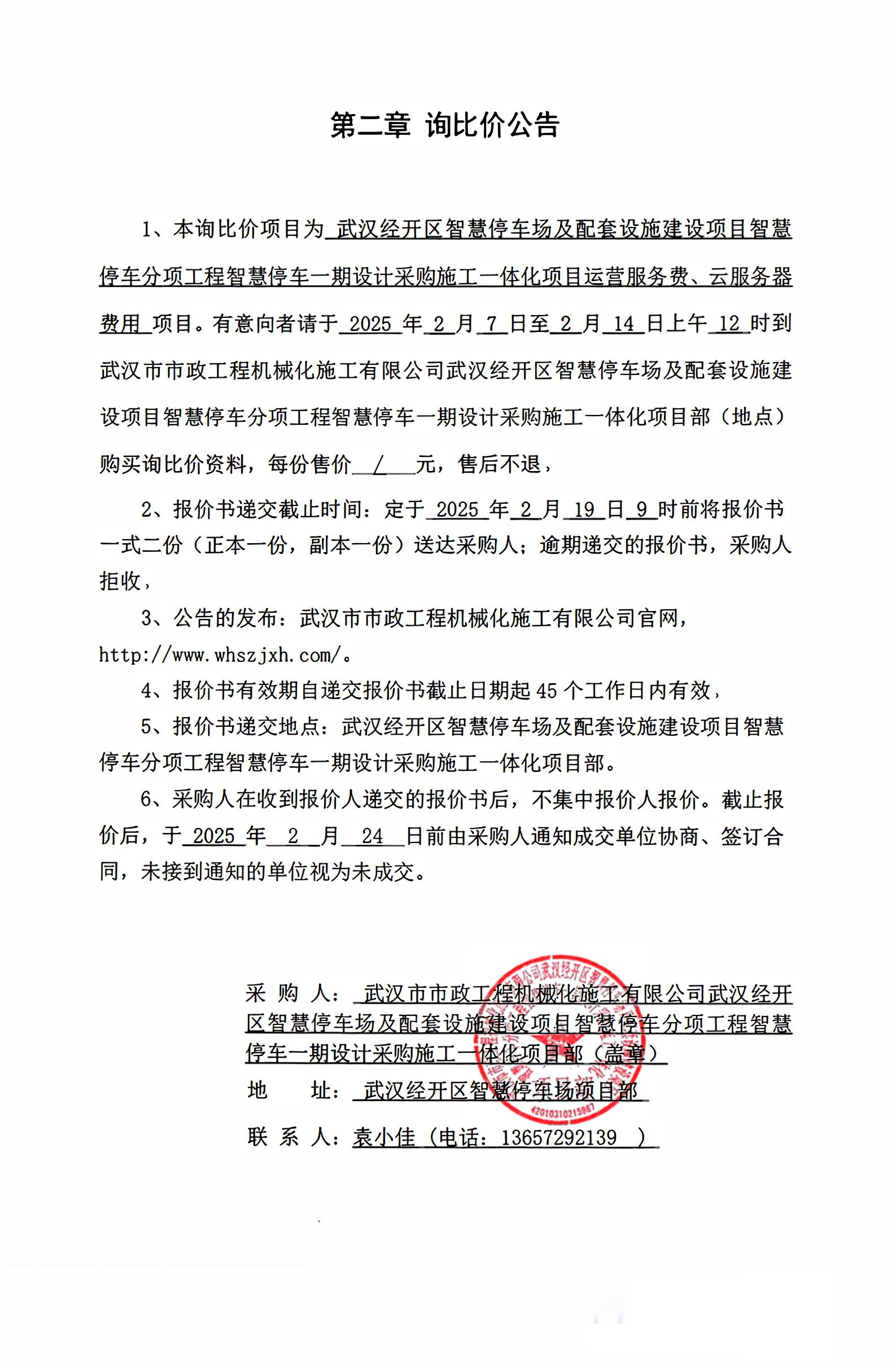 武漢經(jīng)開區(qū)智慧停車場及配套設施建設項目智慧停車分項工程智慧停車一期設計采購施工一體化項目運營服務費、云服務器費用詢價公告