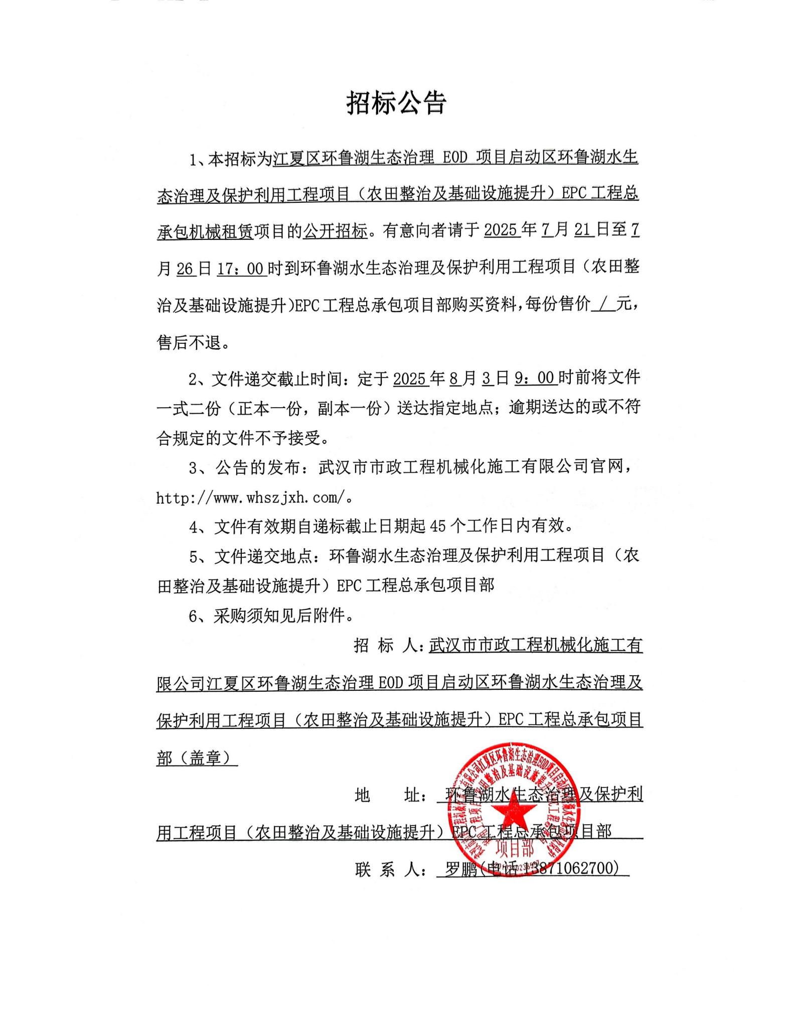 江夏區(qū)環(huán)魯湖生態(tài)治理 E0D 項目啟動區(qū)環(huán)魯湖水生態(tài)治理及保護利用工程項目(農(nóng)田整治及基礎(chǔ)設(shè)施提升)EPC工程總承包機械租賃招標(biāo)公告