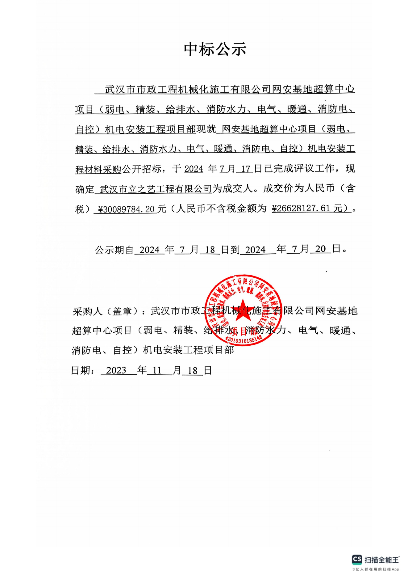 網(wǎng)安基地超算中心項目(弱電、精裝、給排水、消防水力、電氣、暖通、消防電、自控)機電安裝工程-材料采購中標公示