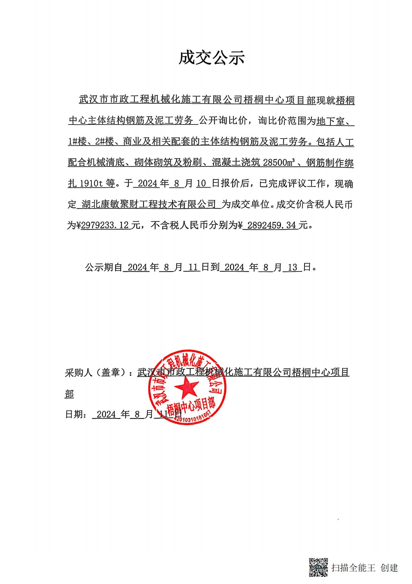 梧桐中心主體結構鋼筋及泥工勞務成交公示